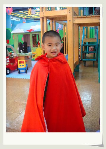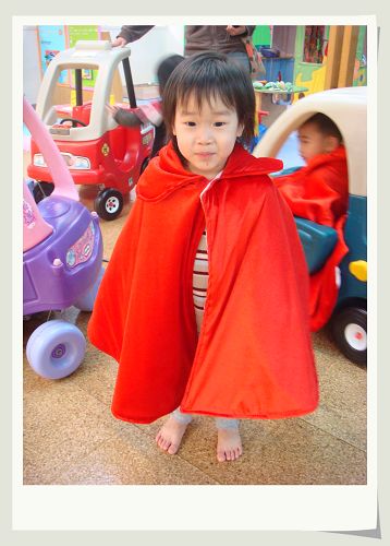 玩了一陣子,哲哲發現旁邊有披風可以讓小朋友自由拿來穿,開心的披著披風說:「我是超人!」
