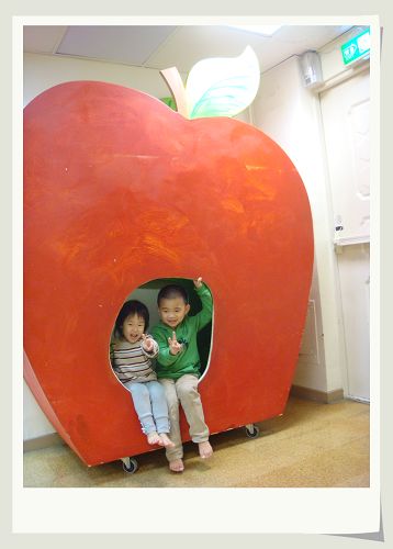 佑佑顧著自己玩,所以薇薇就跟在哲哲後面跑,跟著一起塞進大蘋果中要媽媽幫她拍照。