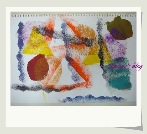 這是佑佑的第二堂美術課,作品就比較直接而單純,用一些簡單的形狀與不同的顏色構成整個作品,我是覺得顏色還蠻豐富的,也有著很自然的平衡感。