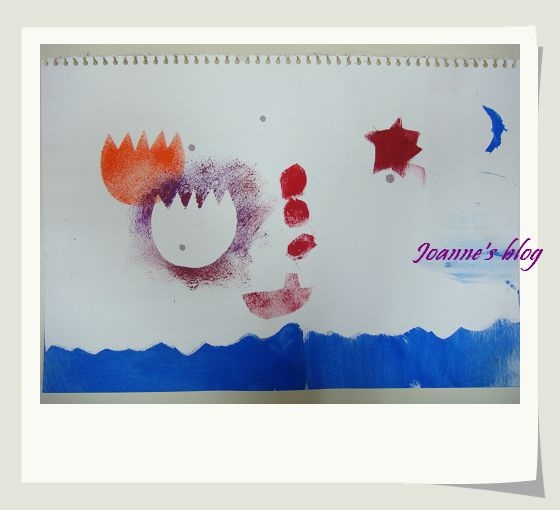 佑佑作品右上方的那一塊就是他沾取太多顏料又很用力的按壓,就看不太出海綿的效果。