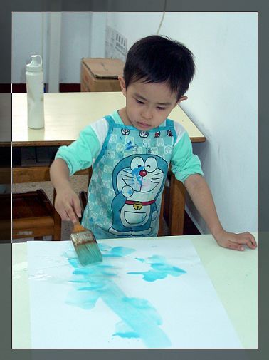 唯一拿到畫筆的機會就是將底圖著色,佑佑畫的很專心。(好有大師的架勢喔!)