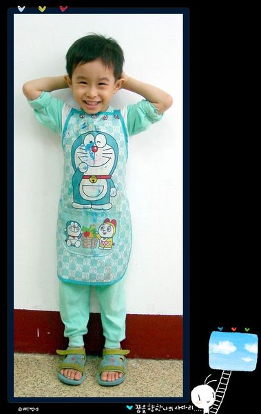 剪好之後,老師又請兩個小朋友來照相,佑佑硬是要擺出奇怪的姿勢,不過臉上的表情一百分喔!