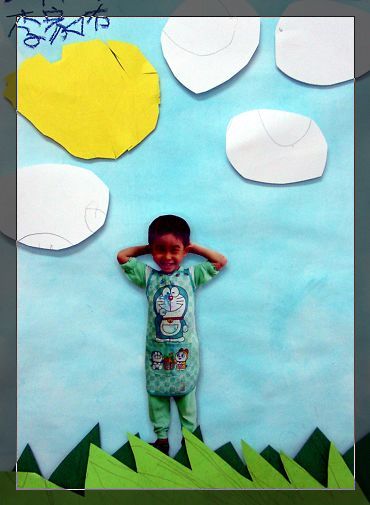 老師請兩個小朋友在西卡紙上畫出雲跟太陽以及草叢之後,就讓兩個小朋友開始裁剪,其實兩個小朋友也都還不太會使用剪刀,還需要老師做最後的修邊。